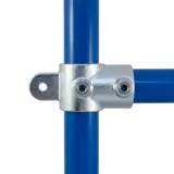 Raccord 174 en té court + embout femelle permettant de relier un tube horizontal à un tube vertical avec un angle de 90°. Accroche possédant sur sa partie haute 1 vis, souvent utilisé pour les intermédiaires de garde-corps et de balustrade.